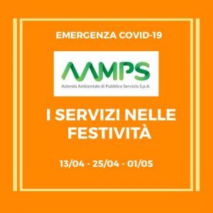 Aamps informa che in occasione delle prossime festività indicate per il 13 aprile (lunedì dell’Angelo), il 25 aprile (anniversario della liberazione d’Italia) e il 1° maggio (festa dei lavoratori) il servizio di raccolta dei rifiuti non verrà erogato.